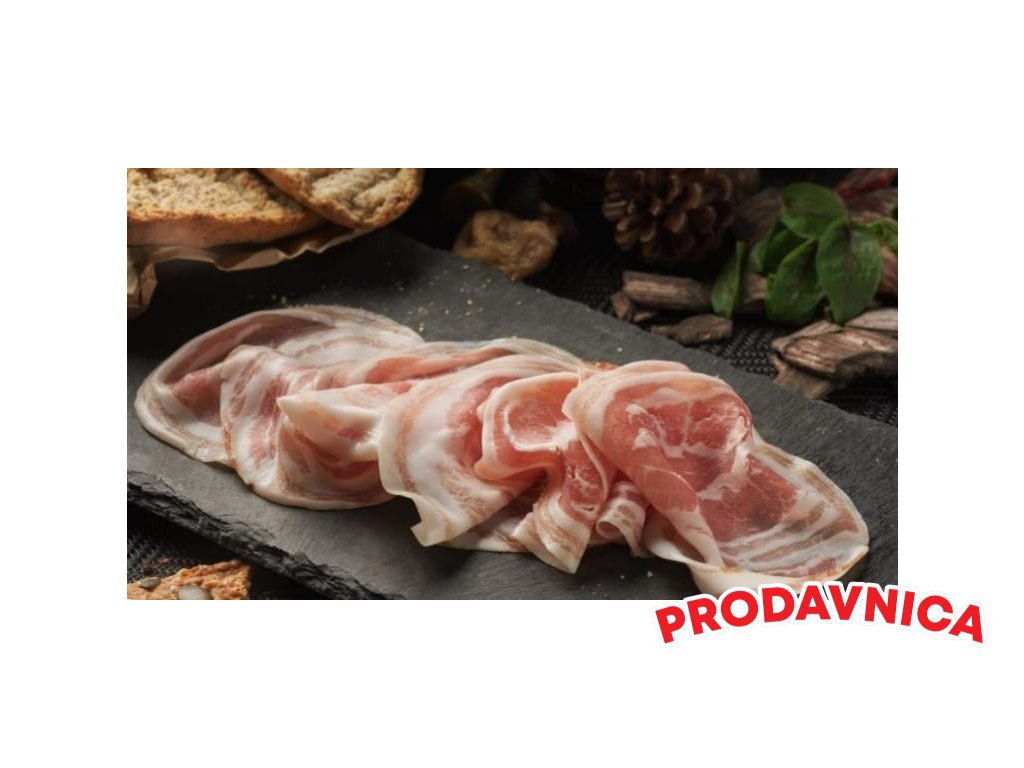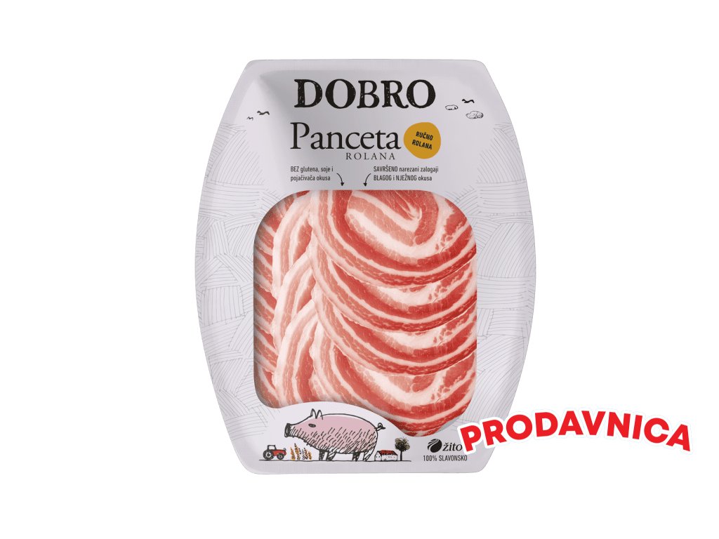 Dobro Pancetta rolovaná – tato pancetta vzniká z pečlivě vybraného vepřového boku, který je ručně rolován, jemně solen, okořeněn a nechán dozrát do dokonalé chuti. Výsledkem je harmonická kombinace slanosti, jemného koření a příjemné textury, která se rozplývá na jazyku.
