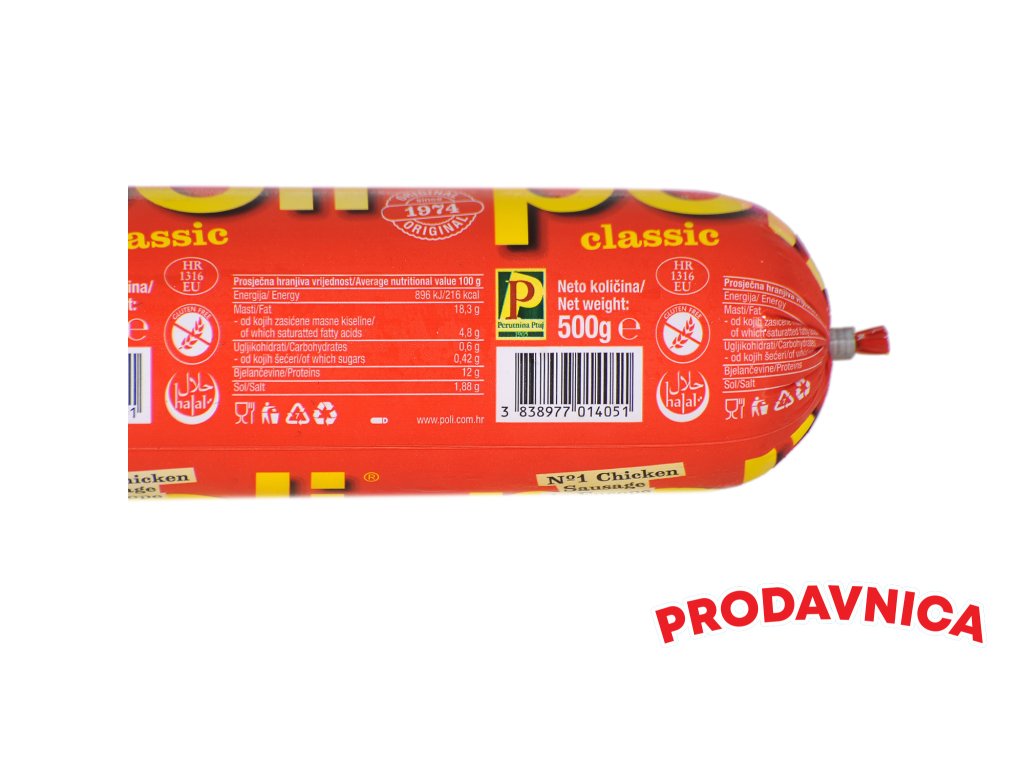 Poli Classic je oblíbená kuřecí salám od značky Perutnina Ptuj, která vyniká měkkou konzistencí a jemnou chutí. Jedná se o pasterizovaný a tepelně zpracovaný delikatesní výrobek.